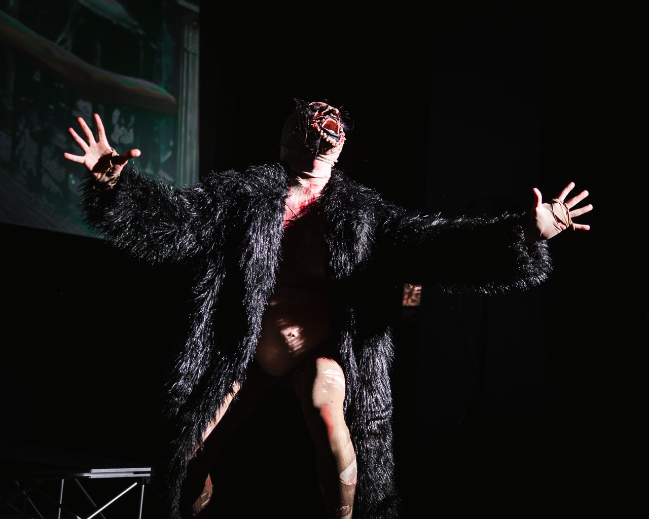 Chaos ensued…. First off, Loose Willis (having done a quick change into some fishnets) stormed and seduced his way through the stalls and back to the stage with a blistering lip-synch to ‘Sweet Transvestite’. Then, Co Kendrah – still in its costume from ELM STREET 2 but with added fishnets and faux fur coat (?!) – led us into the Time Warp as their own demented version of Riff Raff. Token Homo tried to explain what was going on, but kept getting his words wrong in all the chaos and excitement…