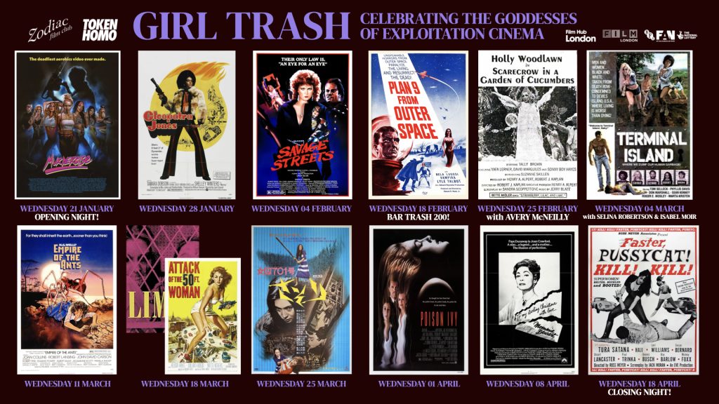 /// GIRL TRASH celebrates the femme filmmakers of trash and exploitation cinema, hosted by Zodiac Film Club and Token Homo. All films are served with introductions, intermissions, prize giveaways, and subtitles / captions where possible. Tickets from £3.50 + fees. Adults 18+ only. Follow @zodiacfilmclub and @tokenhomo on Instagram for info and updates. Please contact the venue for access information. ///